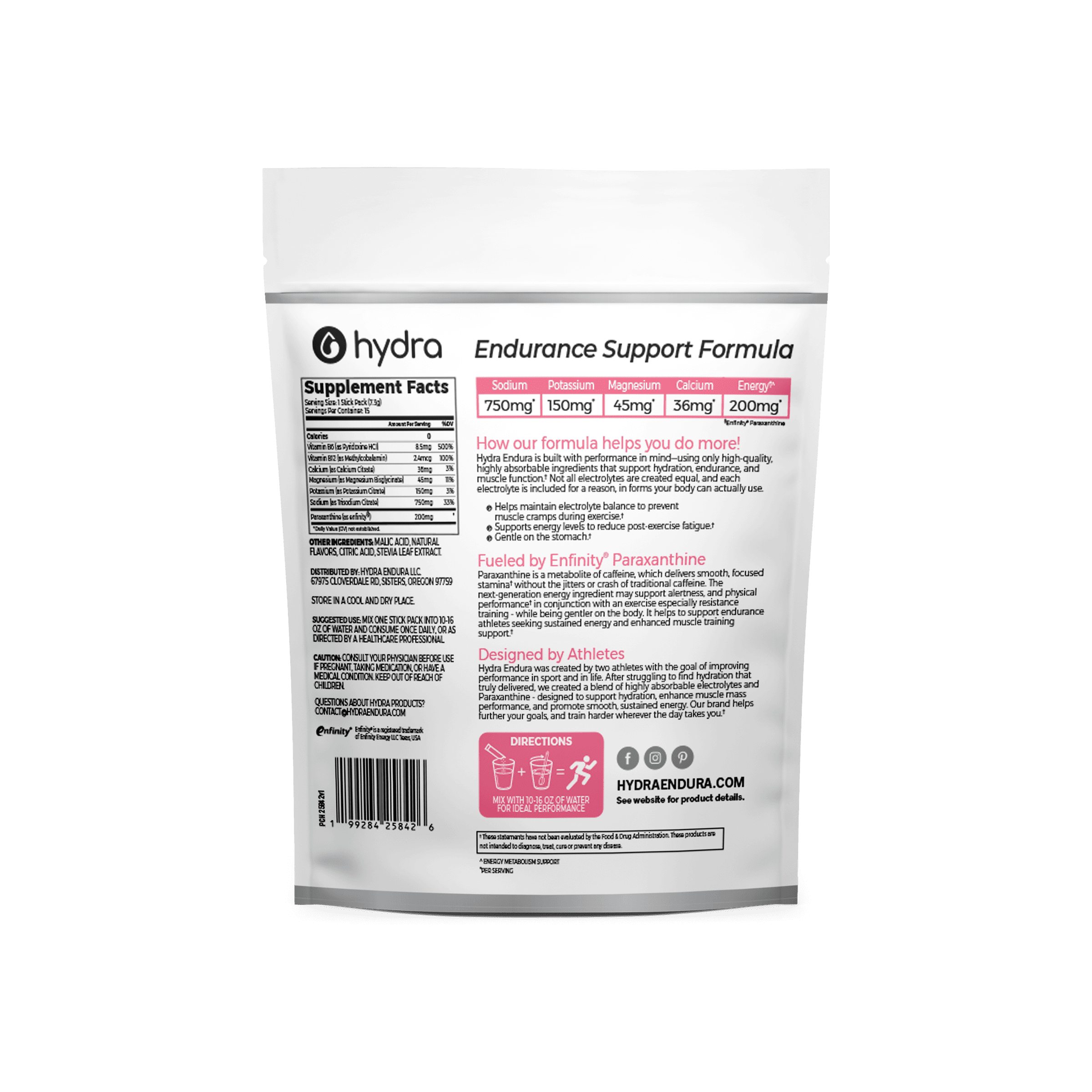Introducing Hydra Endura, our premium hydration formula designed for sustained performance. Crafted with high-quality electrolytes for endurance and optimal hydration, it’s paired with Paraxanthine (Enfinity) for smooth, clean energy. The crisp lemonade and natural raspberry sweetness offer a refreshing, light taste that’s easy on the stomach. Ideal for long runs, intense workouts, or all-day hydration, Hydra Endura delivers the perfect balance without the sugar, caffeine, or crash.